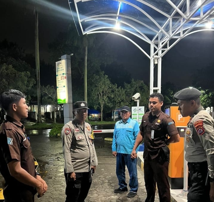 Personil Bhabinkamtibmas wilayahnya Bripka Agustoni melakukan patroli dialogis dengan menyapa petugas satpam Kantor Unit Pelaksanaan Teknis (UPT) PLN