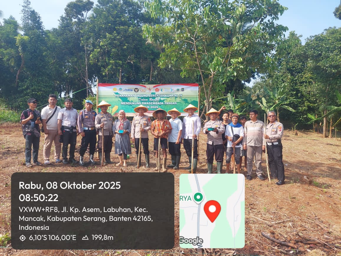 Penanaman Jagung serentak Kuartal IV Seluruh Indonesia di lahan milik kelompok tani Bpk. Maman Rt. 01/01 Kp. Macute Kel. Angsana Kec. Mancak-Serang daerah hukum Polres Cilegon.