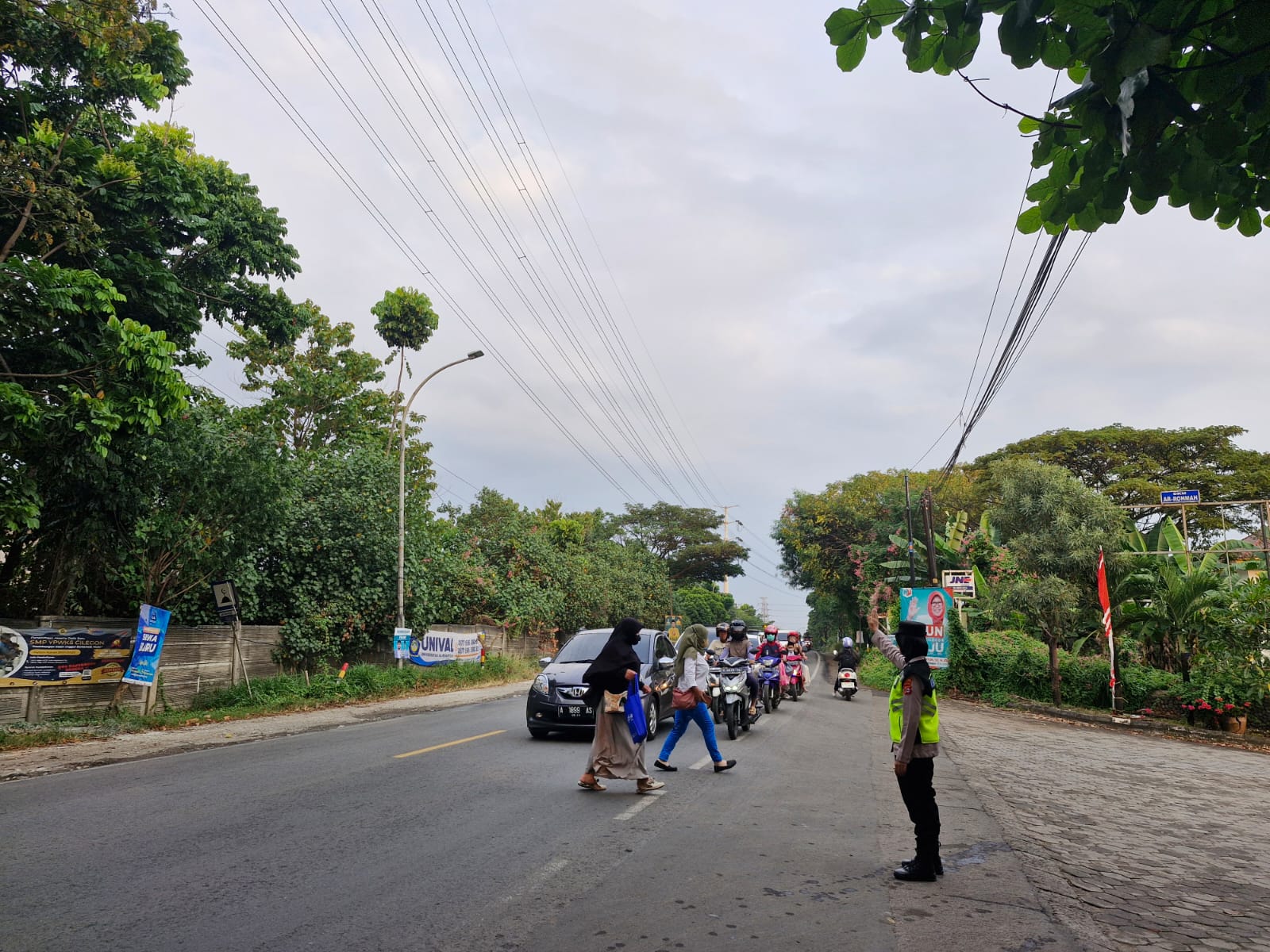 Cilegon,Polres Cilegon Polda Banten Pada Senin/13/07/2025 Pukul 06.30 Wib, Personil Siwas Polres Cilegon, Aipda Emi Prasetyo melaksanakan kegiatan pengaturan arus lalu lintas di Jalur Protokol jalan utama Kota Cilegon tepat nya di jalur depan perumahan arga baja Pura Kota Cilegon.
