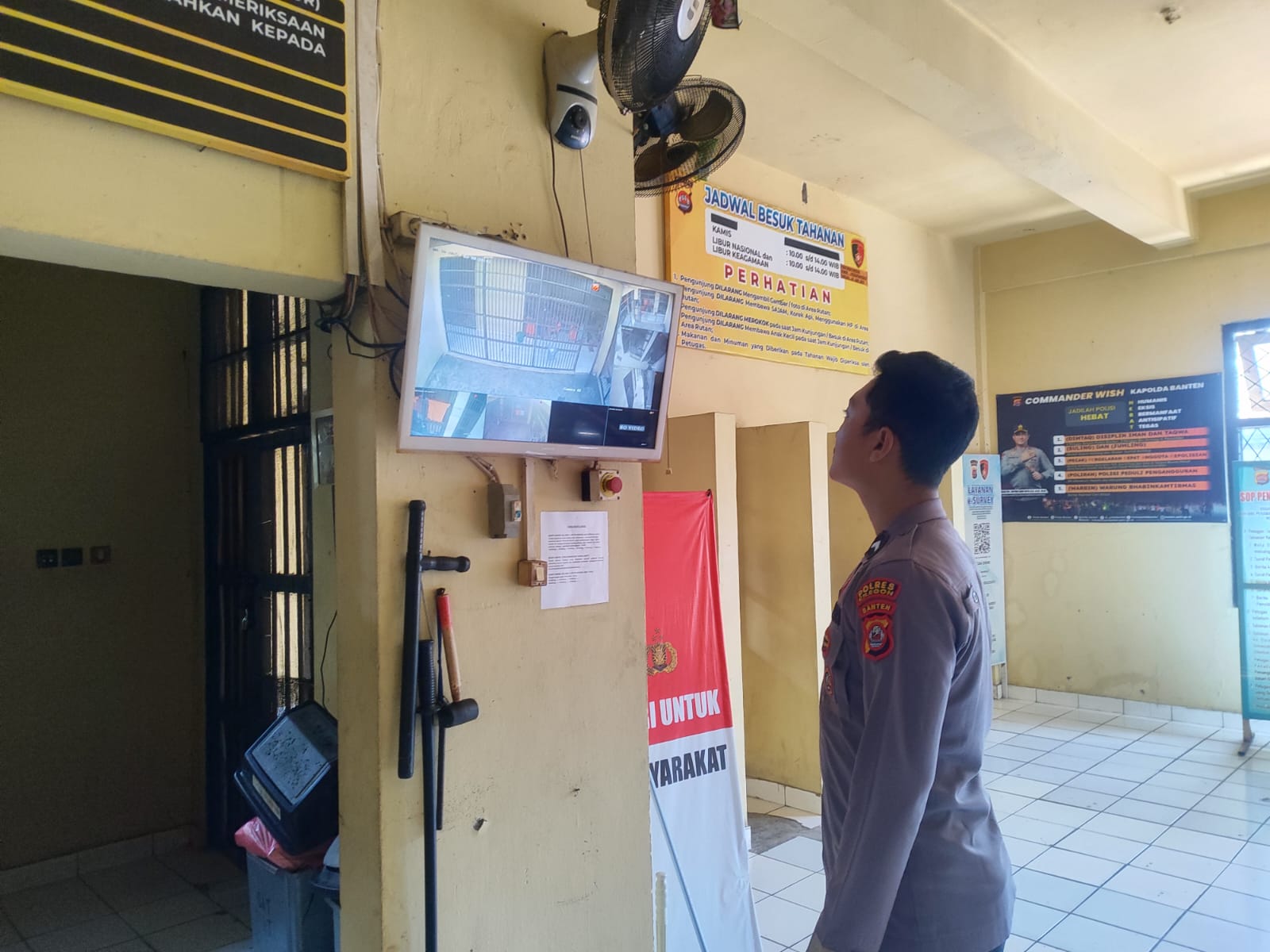 Personil Sat Tahti Cek Tahanan melalui CCTV yang ada di Rutan Polres Cilegon.