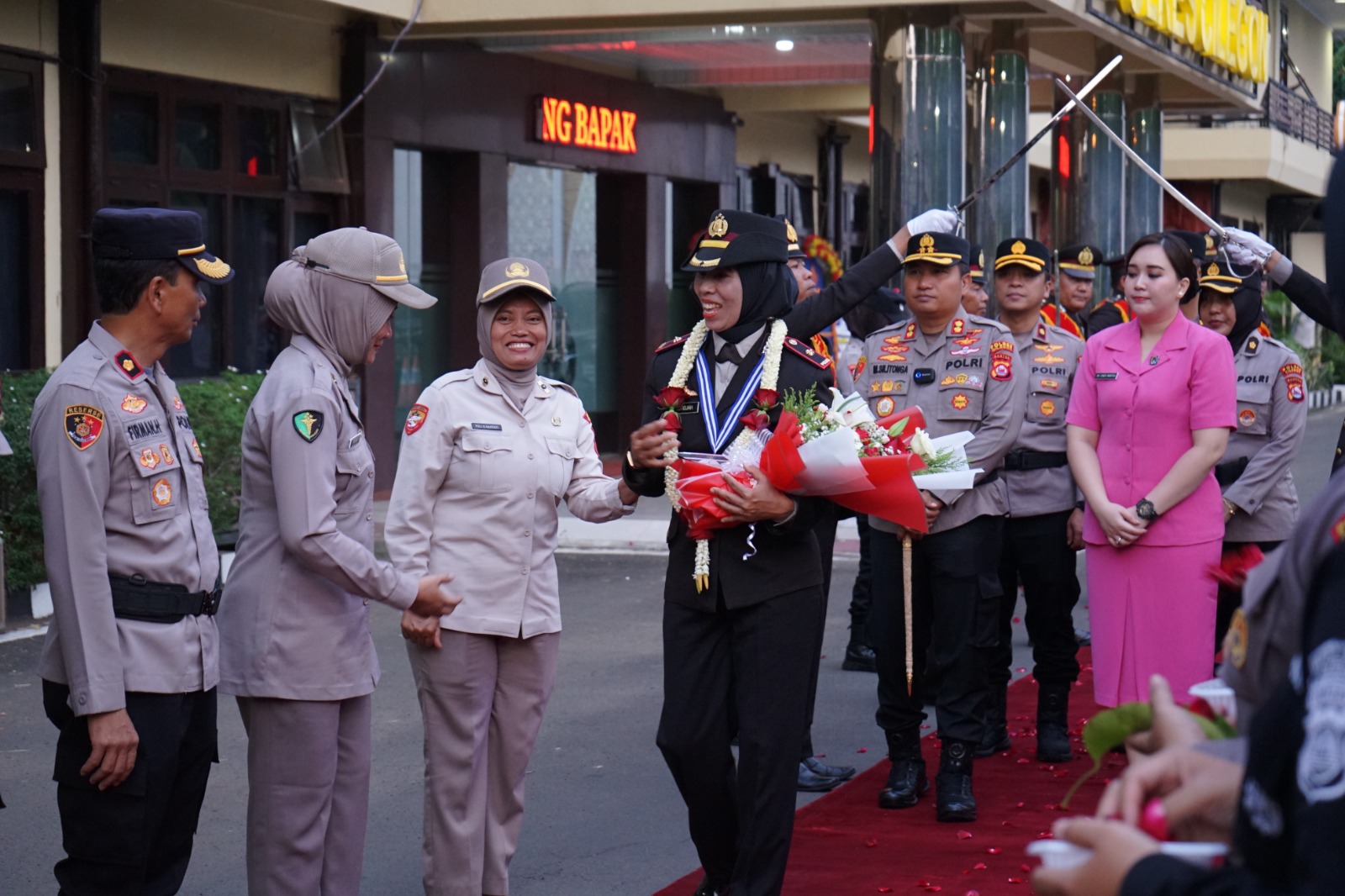 Kegiatan kemudian dilanjutkan dengan tradisi Farewell, di mana Purnawirawan Kompol Chotidjah, S.H. dilepas dengan penghormatan saat berjalan meninggalkan gerbang penjagaan Polres Cilegon. Deretan personel berdiri tegap memberikan penghormatan terakhir, sementara lantunan lagu perpisahan mengiringi langkahnya menuju babak baru dalam kehidupan setelah pengabdian panjangnya di Kepolisian.