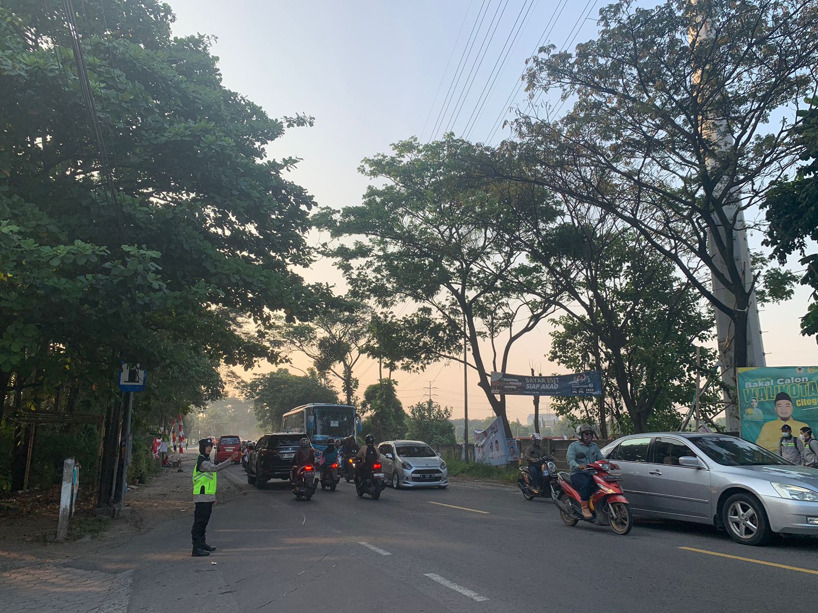 Cilegon,Polres Cilegon Polda Banten Pada Rabu/05/11/2025 Pukul 06.30 Wib, Personil Siwas Polres Cilegon, Aipda Emi Prasetyo melaksanakan kegiatan pengaturan arus lalu lintas di Jalur Protokol jalan utama Kota Cilegon tepat nya di jalur depan perumahan arga baja Pura Kota Cilegon.