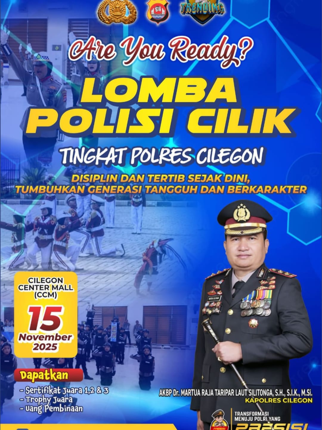 Polres Cilegon kembali menyelenggarakan kegiatan positif bagi anak-anak dengan mengadakan Lomba Polisi Cilik di Cilegon Center Mall (CCM). Kegiatan ini bertujuan untuk mengenalkan profesi polisi kepada anak-anak sejak dini dan meningkatkan kesadaran akan pentingnya disiplin dan keselamatan.