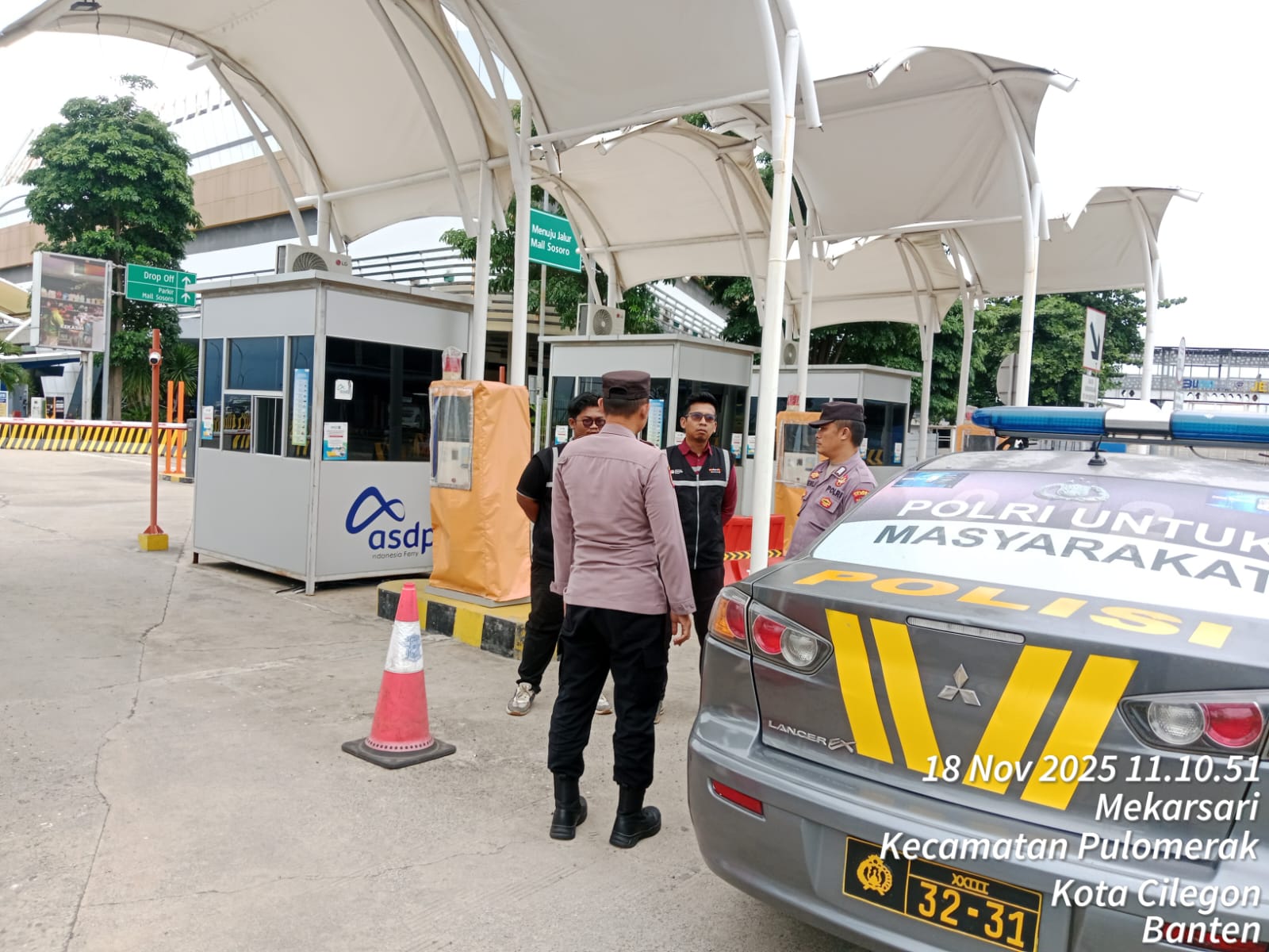 Cilegon - Personel Polsek Kskp Merak Polres Cilegon Polda Banten melaksanakan sambang dan patroli kawasan pelabuhan merak dalam rangka menjaga Harkamtibmas di Kawasan Pelabuhan Merak, Selasa (18/11/2025).