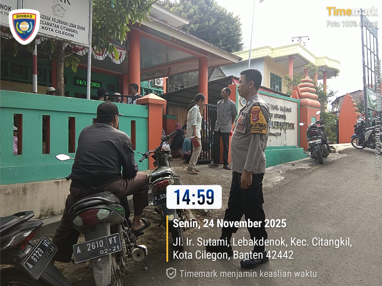 Cilegon - Bhabinkamtibmas Kelurahan Lebak Denok, AIPTU YUDI SETIAWAN, melaksanakan pengamanan dan monitoring bantuan langsung tunai dari Kementerian Sosial RI di Kantor Kelurahan Lebak Denok, Kecamatan Citangkil, Kota Cilegon, Senin (24/11/2025).