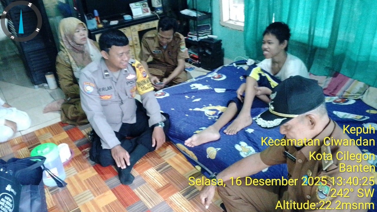 Cilegon - Bhabinkamtibmas Kel. Kepuh, AIPDA MERE ERLANSYAH, bersama Lurah Kepuh, membesuk anak yang sakit, Miftahul Hilmi, di Link. Rombongan RT. 01/01 Kel. Kepuh Kec. Ciwandan, Selasa (16/12/2025).