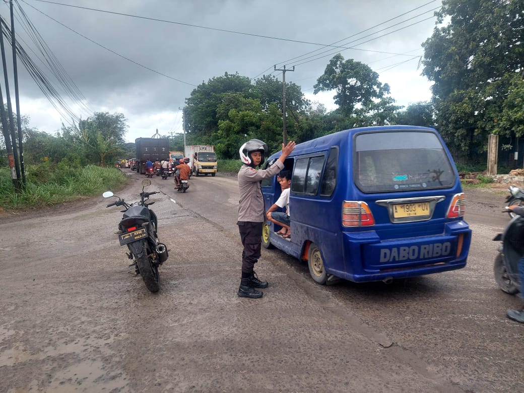 Ciptakan Situasi Lalu Lintas Aman, Bripka Bambang Personil Polsek Bojonegara Laksanakan Gatur Lalin Sore Hari Di Jalan Raya PT Bam Bojonegara