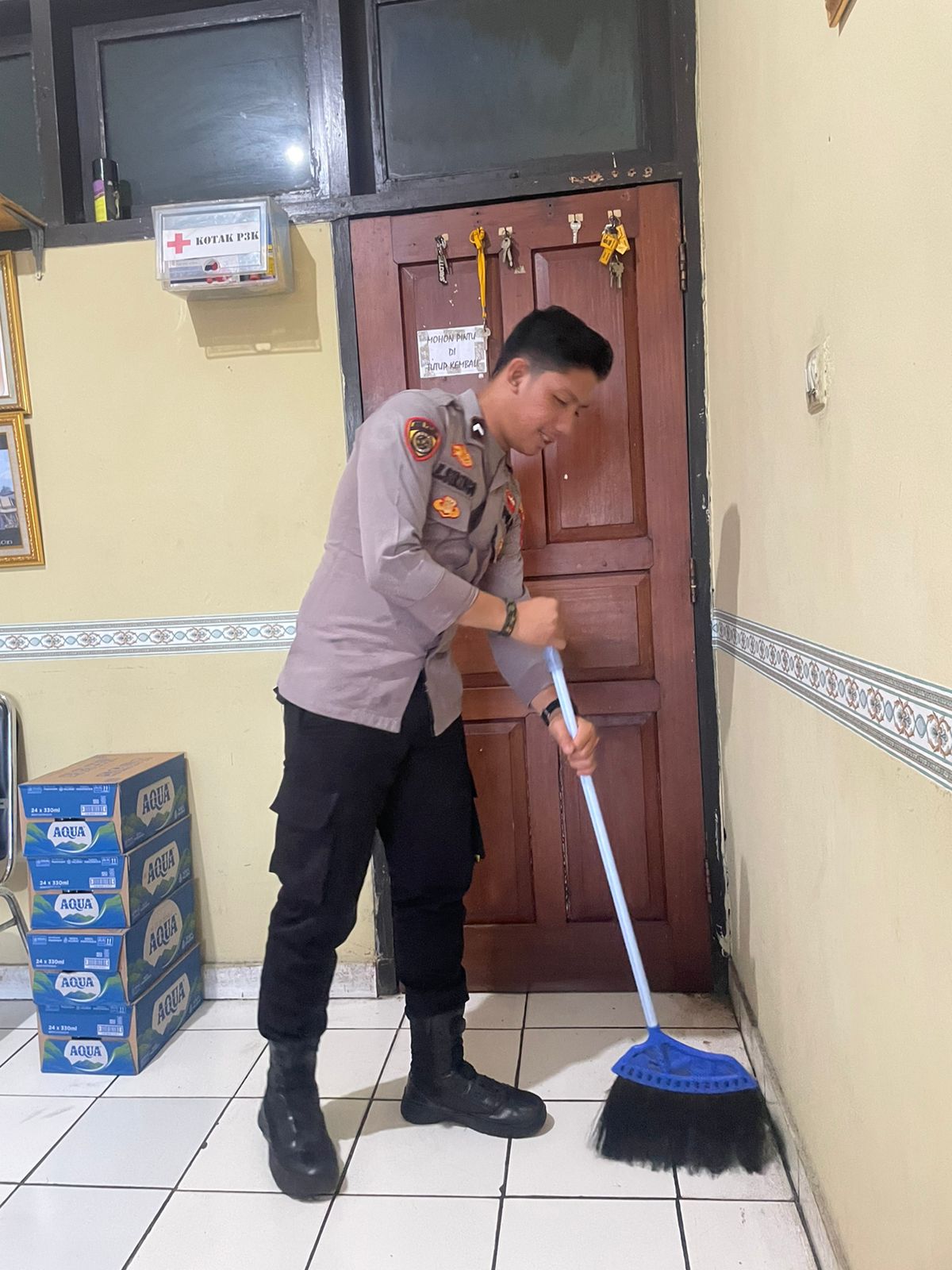 Anggota Bag SDM Polres Cilegon, Pelaksaan kegiatan membersihkan rruangan kerja secara rutin.