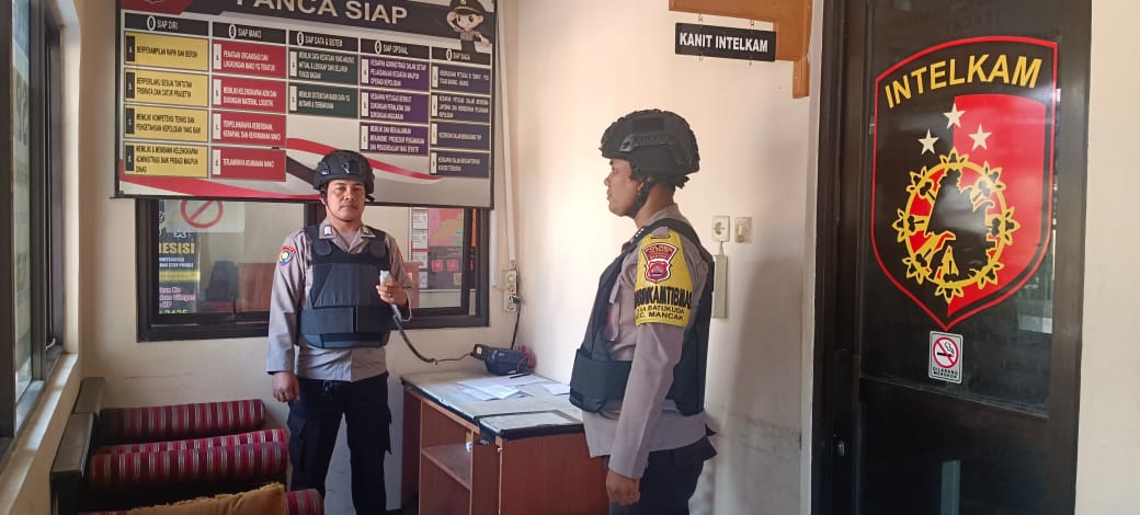 “Anggota piket jaga Polsek Mancak melaksanakan Sispam Mako dilengkapi dengan bodyvest, helm kevlar, dan senjata api salah satu upaya peningkatan kemanan mako guna mencegah hal-hal yang tidak dapat di duga selama pelayan berlangsung.”
